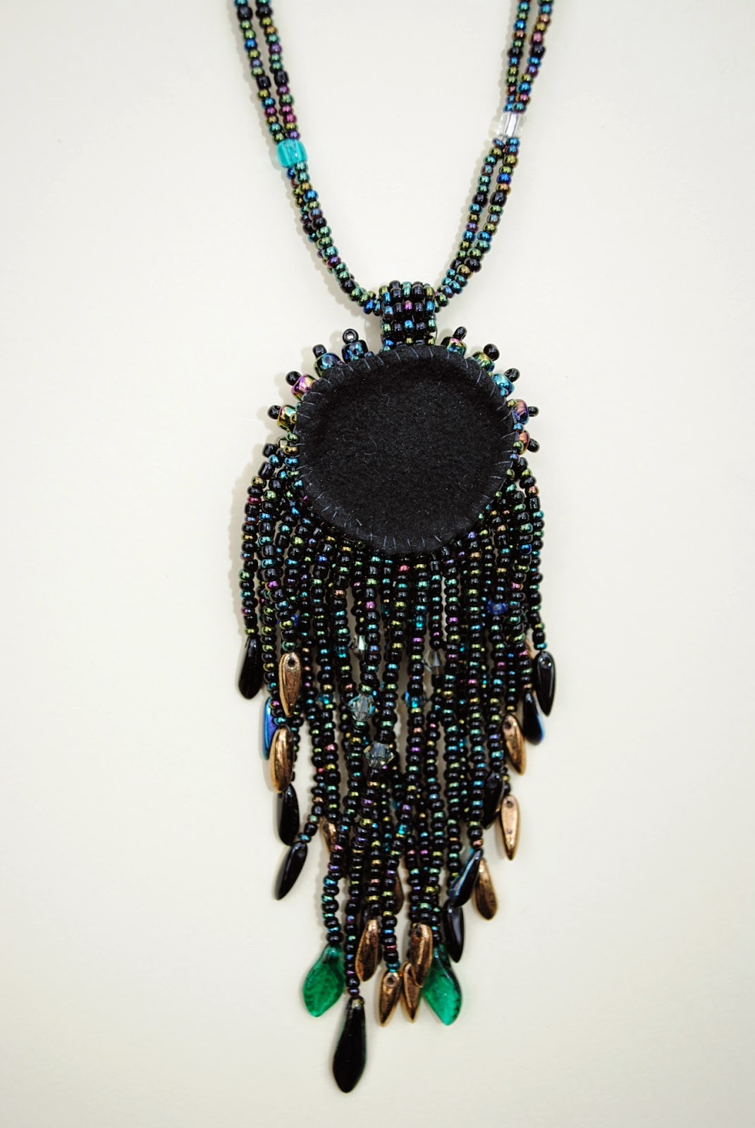 This is a really special piece, bid high : ) This style takes about 30-40 hours to make, and includes a gorgeous sterling and silver-filled clasp. The focal bead is a handmade dichroic glass cabochon surrounded with a border of glass seed beads in the peyote stitch technique using magical FireLine thread, which is very strong and "wirey" enough to scrunch up so that the fringe curls a bit. It's perfectly okay to touch and play with the fringe, as I do knot my work at the top of each strand so it's very secure. This necklace is about 24 inches long and the pendant is about 3-4 inches long, so it sits right at the heart of your chest, like a protective, celebratory shield.